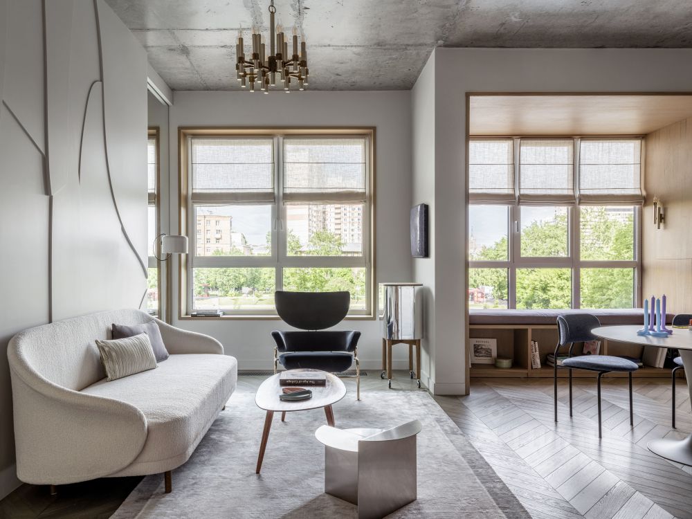 Из окон квартиры открываются панорамные виды на центр Москвы, здание МИДа, высотку на Кудринской площади, Москва Сити, Новый Арбат, БЦ «Оружейный» и др.