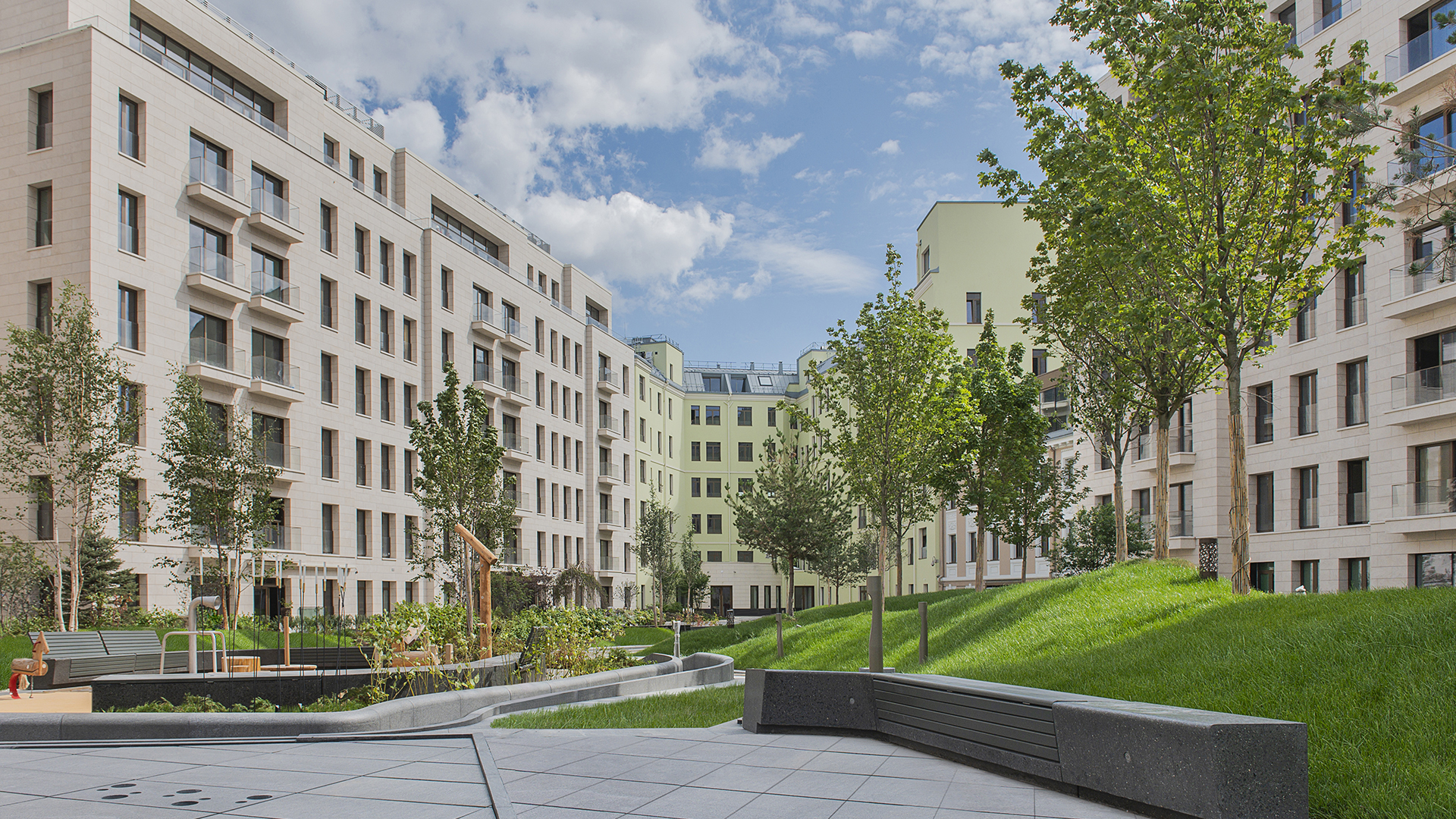 Комплекс имеет большой зелёный парк 1.9 га., с прогулочными бульварами и приватными дворами.